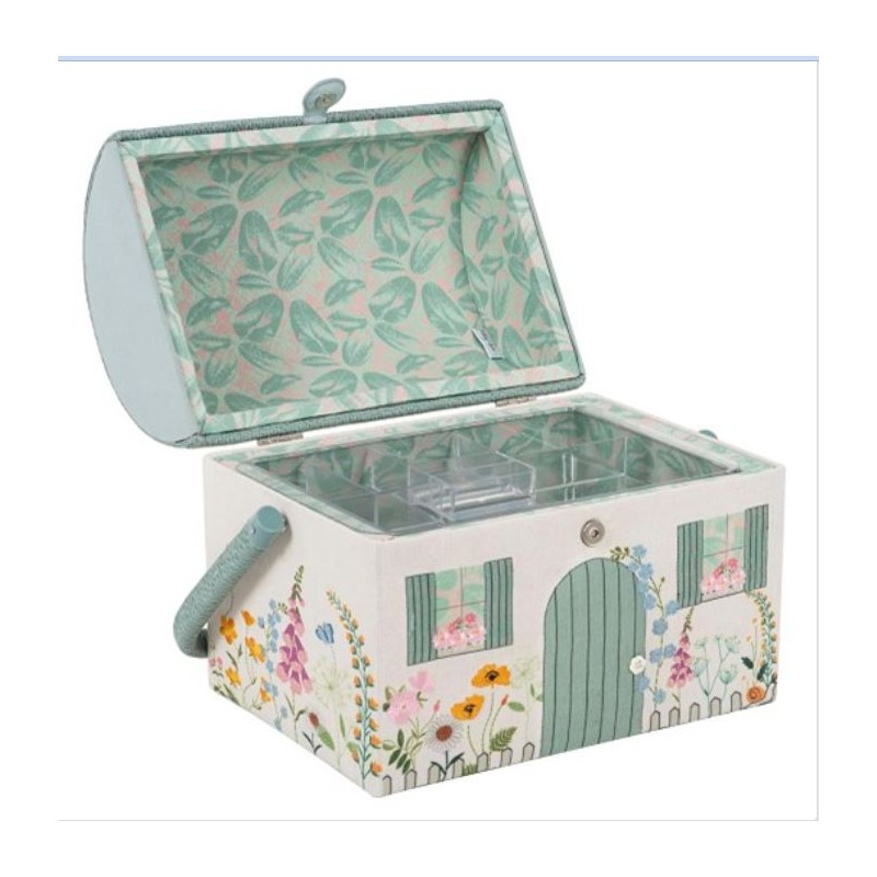 Nouvelle boîte à couture d'inspiration campagnarde avec toit et poignée en osier. Fleurs et détails brodés. Plateau intérieur en plastique dur avec des compartiments pour les accessoires de couture. Dimensions de l'article : 21 x 30 x 26cm. Nettoyage ponctuel uniquement.