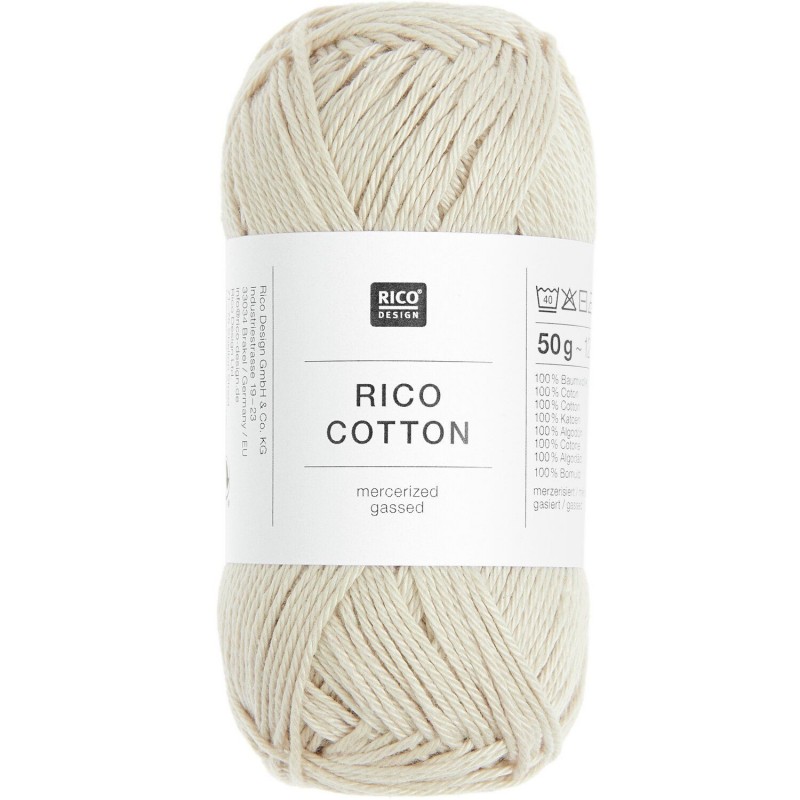 Rico Cotton est composé à 100 % de Cotton. Le fil est mercerisé et gazé, ce qui lui confère une surface lisse et régulière ainsi qu'une résistance accrue. Il convient à divers projets de tricot et de crochet qui exigent une bonne tenue de forme et un aspect soigné.