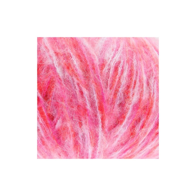 Le mélange de mohair multicolore Fashion Fabulous 4 aran se distingue par sa structure exceptionnelle. Le fil est composé de quatre fils parallèles de couleurs différentes, tous entourés d'un duvet de mohair. Cela confère au fil non seulement un aspect coloré captivant, mais donne également aux tricots un duvet dense et coloré.