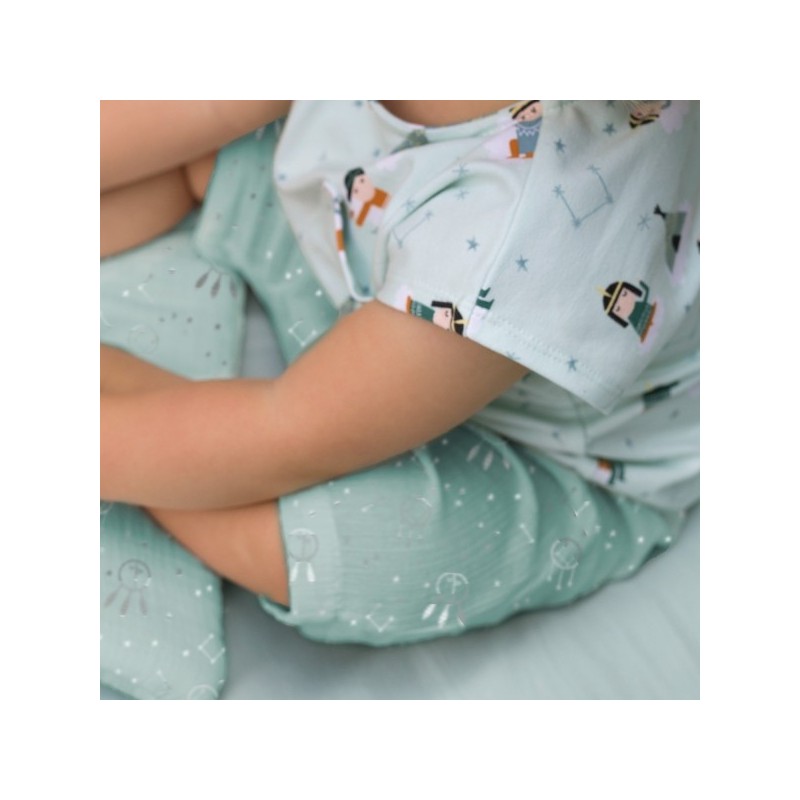 Tissu pour t-shirt aux dessins d'indiens américains, de grands tricoteurs aux traditions ancestrales. Sur un fond vert d'eau. Idéal pour coudre des vêtements confortables comme des robes, t-shirts et pyjamas.