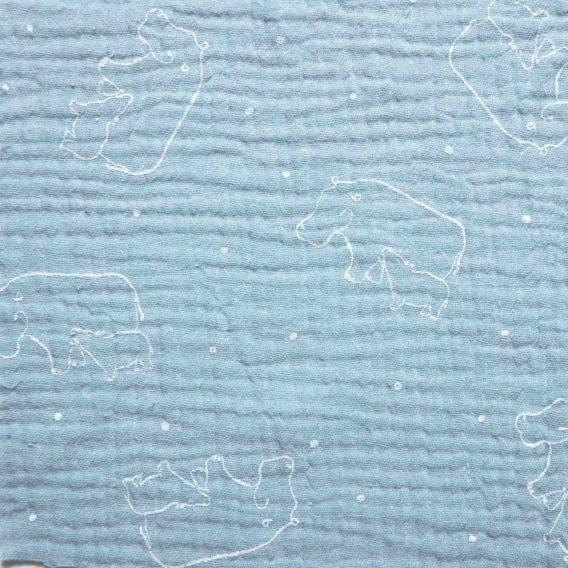 Tissu double gaze 100% coton aux délicats motifs d'hippopotames avec leur bébé en blanc sur un fond couleur bleu ciel. Un motif atemporel parfait pour une baby shower.