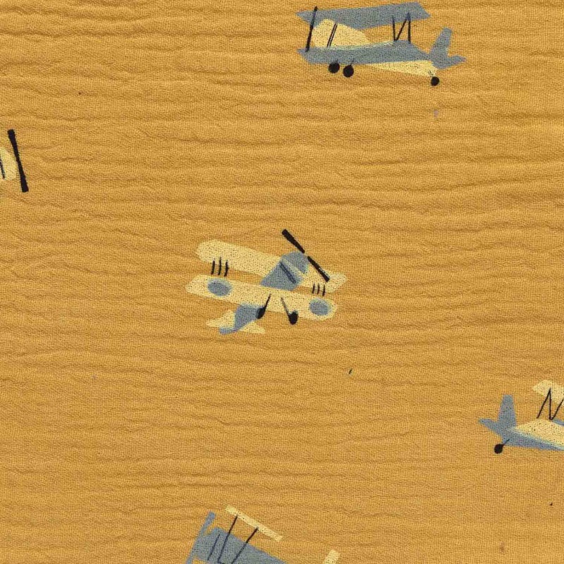 Tissu 100% coton aux motifs de petits avions sur un fond couleur jaune moutarde. Un tissu doux et moelleux, double gaze de coton, parfait pour coudre tout type de vêtements et accessoires bébé et enfant. Trouvez l'inspiration dans notre catalogue de patrons de couture et trouvez-y votre modèle préféré.