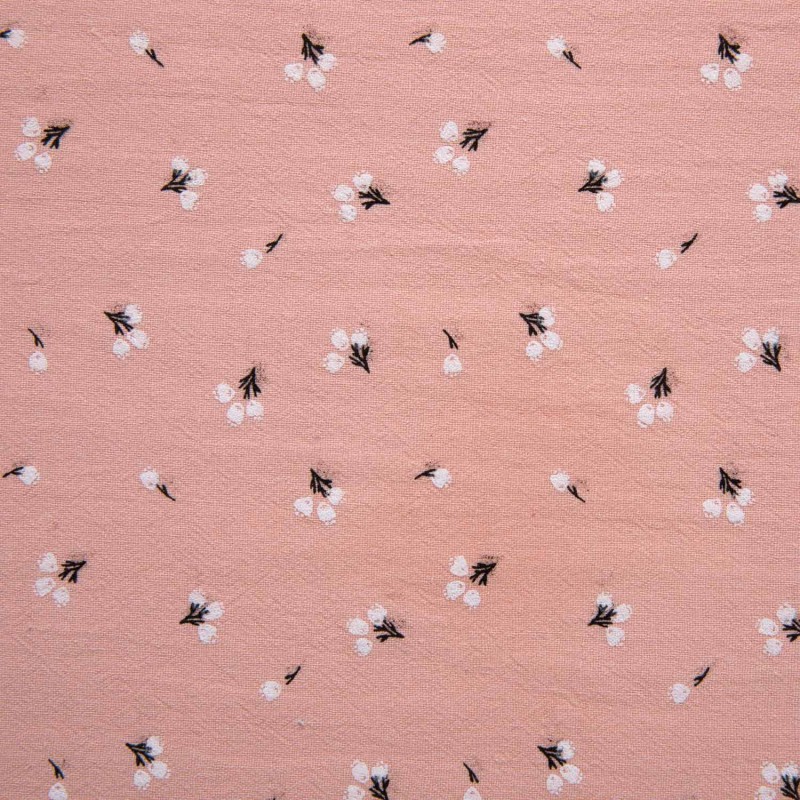 Tissu 100% coton effet rustique aux petits motifs fleuris sur fond couleur pêche. Un tissu très agréable et doux au toucher qui présente un nouveau et original effet en relief d'un de ses motifs. Un tissu idéal pour la confection de vêtements atemporels tels que des robes, des pantalons et des chemisiers.