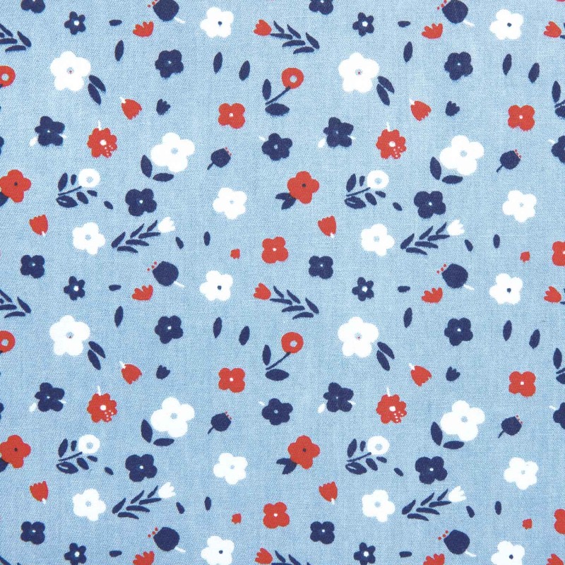 Tissu 100% coton denim au motif de petites fleurs en rouge et bleu foncé sur un fond bleu jean clair. Cette saison, imaginez-vous dans une robe cousue de vos propres mains.
