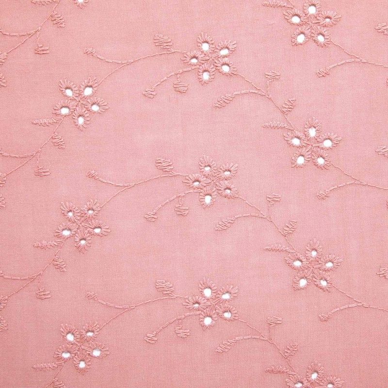 Tissu 100% coton avec une broderie fantaisie et de type voile. Motif fleuri effet ajouré dans une couleur corail. Un tissu très adapté pour la confection de vêtements légers et confortables pour les hautes températures des jours d'été.